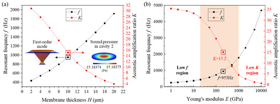 Acoustic simulation on (a) the effect of diaphragm thickness H on K and f and (b) the effect of Young’s modulus E of the diaphragm on K and f.