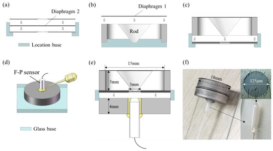 Fabrication process of the SPAS. (a) Clamping diaphragm 2 between two steel gaskets. (b) Bonding diaphragm 1 onto the endface of a steel casing. (c) Fixing the parts that make up the SPAS. (d) Inserting an F-P probe into a location base. (e) Assembling the casing with the locating base installed with an F-P probe by epoxy glue. (f) Picture of the assembled SPAS.