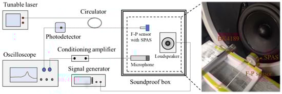 To examine the sensitivity-enhancing effect induced by the introduction of SPAS, an acoustic pressure measurement setup was established as shown in Figure 6. A signal generator (DG5102, Rigol, Beijing, China) offered a dynamic acoustic signal in the range of 0.2–10 kHz via a conventional loudspeaker. The generated acoustic signal was detected simultaneously by the developed F-P sensor and a reference microphone (BK4189, BK, Nærum, Denmark) with a sensitivity of 50 mV/Pa, which were placed at the two symmetry positions closer to the loudspeaker along the central axis of the loudspeaker in a self-made soundproof box. The F-P sensor was driven by 1550 nm incident light with an optical power of −16.3 dB sent by a tunable laser (AP3350A, APEX, France) for the optimal voltage output. Then the resulting interference signal through a three-port circulator (6015-3-APC, Thorlabs, Newton, NJ, USA) was fed into an oscilloscope (DPO3054, Tektronix, Beaverton, OR, USA) for optical intensity demodulation through a low noise photodetector (PR-200K4177, Conquer, Beijing, China) with a 200 kHz bandwidth. In this way, the voltage output from BK4189 was amplified by a conditioning amplifier (BK1708, BK, Nærum, Denmark) and then external acoustic pressure applied on the diaphragm 1 could be determined by the amplified voltage and the reference microphone output. Hence, the sensitivity verse acoustic pressure can be obtained for the developed F-P sensor with or without SPAS. Then, the amplification ratio K in different acoustic frequencies can further be solved by the ratio of the two measured acoustic responses when the SPAS was used or not.