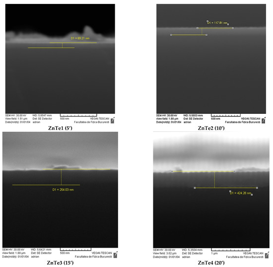 Examples of SEM images of cross sections of the fabricated ZnTe thin films (a local thickness estimation for each kind of film—the difference from the average values is due to local variations and it is in the errors limits).
