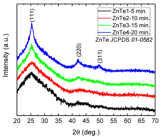 X-ray diffraction patterns were recorded and diffractograms for the samples were obtained at different deposition times: 5, 10, 15, and 20 min, labeled as ZnTe-5 min, ZnTe-10 min, ZnTe-15 min, and ZnTe-20 min, are presented in Figure 2. Diffraction features located at 25.24°, 42.34°, and 49.59° can be assigned unambiguously to (111), (220), and (311) reflections of the cubic ZnTe phase, according to the JCPDS database, card no. 01-0582. Therefore, ZnTe thicker films are polycrystalline with the respective zinc-blende structures. It can be observed that features are amorphous bands at 5 and 10 min, and evolve to diffraction peaks at 15 and 20 min. We should note that, at these stages, the chemical reaction of Zn with Te was complete, even if the crystal quality was poor—no Zn metallic phase or shift on the peak position can be observed. The evolution of the crystallinity at different stages of growth suggests the existence of a relationship between the crystal quality and the layer thickness, as a result of different deposition times. An increase of the crystallite size with the thickness for ZnTe films was also reported by Aboraia et al. [23], where films of different thicknesses were obtained by plasma immersion O− ion implantation. The Scherrer equation was used so we could get a quantitative idea about the crystal quality. This equation relates the peak broadening by the crystal quality in the following way [24]: