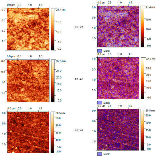 AFM characterization of ZnTe thin films with different thicknesses show that all films have a granular structure that evolve as thickness increases. As can be observed from the two-dimensional (2D) 2 μm × 2 μm images presented in Figure 3, the thickness increase led to surfaces with a much smaller z-range fact, meaning surface flattening and smoothening. Using Gwyddion software, manual surface segmentation was performed to evaluate medium grain parameter sizes (http://gwyddion.net/download/user-guide/gwyddion-user-guide-en.pdf, accessed on 30 August 2021). Specific surface segmentations for each kind of ZnTe film surface are presented in Figure 3. In the figure, the violet regions represent water shade masking of deeper film regions where the grain segmentation could not be clearly performed. Grain borders assigned by segmentation are shown in a red–brownish color. The segmentation was performed to identify the largest number of similar-sized grains present on the 2 μm × 2 μm surface scan.