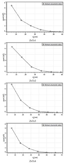 Minimum circumcircle radius value statistic variations onto surfaces of ZnTe1,2,3,4 thin films, presented in AFM images.