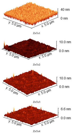 To better analyze the surface roughness evolution, examples of three-dimensional (3D) AFM images of ZnTe films obtained from larger scan sizes (5 μm × 5 μm) are shown in Figure 9. The z-range of the specific 3D representations was chosen to be equal to the highest feature onto the surface, as a better way to observe the regularities and irregularities of the specific surface roughening process determined by film thickening.