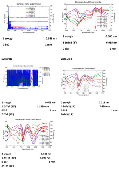 Figure 10 presents the SE measurements and theoretical modeling at three incidence angles (60°, 65°, and 70°) in the spectral range 250–1750 nm for estimation of optical roughness of the substrate and the ZnTe films analyzed during this study. Good qualitative agreement was found between the SE measurements and the theoretical simulations. The fitted SE spectra deviate significantly from the measured ones for the thinner films. These differences may be associated with the deviations of film stoichiometry and crystallinity in the various stages of growth from the ideal models. The differences are smaller for the thicker films. Further studies for better correlations are ongoing.