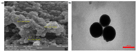 The scanning electron microscope (SEM) image shown in (Figure 2a) reveals the surface morphology of the prepared spherical nanocarriers. The structure had no porosity, the particle shape was good, and the particle size was homogeneous. The transmission electron microscope (TEM) image (Figure 2b) explains the internal structure of the material, which in the nanocarrier image was measured to be about 150 nm in size.