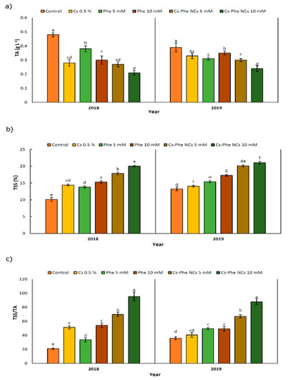 In this study, notable decreases of 56.25% and 47.92% in TA were recorded with 10 mM of CS–Phe NCs compared to the control in 2018 and 2019, respectively. As reported by Ishkeh et al. [33], total acidity is an indicator of the senescence status of fruits and a relevant decline in the TA might be a consequence of higher respiration and ripening rates, which are related to the consumption and conversion of organic acids to sugars during respiration [33].