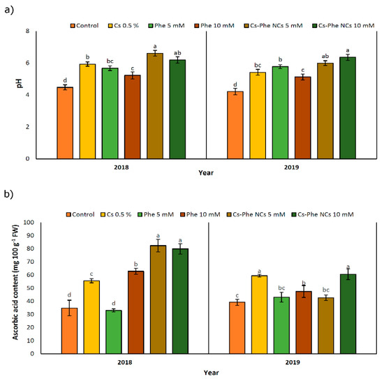 NP treatments led to an increase in the ascorbic acid content in both study years. In 2018 and 2019, 5 mM and 10 mM of CS–Phe NCs resulted in the highest ascorbic acid content, respectively (Figure 4b). However, in 2018, Phe treatment at 5 mM concentration decreased the ascorbic acid content. Except for 10 mM of CS–Phe NCs and 0.5% CS, the remaining NP treatments had no significant differences compared to the control group. The relevant increases can be attributed to low respiration rates, as reported in many crops [38]. Interestingly, no clear findings concerned with coatings with or without phenylalanine were noted for ascorbic acid, revealing the necessity of studies on the possible impacts of chitosan and its conjugation with phenylalanine on oxygen and carbon dioxide concentrations related to respiration.