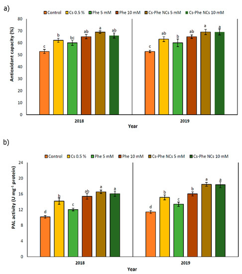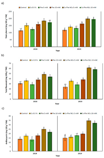 Being confined to the plant kingdom, phenolic compounds are important secondary metabolites due to their diverse chemical structures. Corresponding to their diversity, relevant compounds confer a certain degree of protective roles in response to biotic and abiotic stress factors by acting as non-enzymatic antioxidants [39]. As reported before [33], phenolic compounds with their natural fungicide potential might indirectly decrease the decay extension for horticultural crops, in particular. The well-known phenolic compound biosynthesis pathway is based on phenylalanine, tyrosine, and tryptophan amino acids [41]. Along with the target and hypothesis of yielding a higher phenolic compound content, chitosan nanoparticles were coated with phenylalanine as a significant precursor of phenolic compounds. Accordingly, the total phenolic content was significantly affected with NC treatments, reaching the highest value at 5 mM and 10 mM of CS–Phe NCs in 2018 and 2019, respectively (Figure 5a). In particular, chitosan coated with phenylalanine led to a greater improvement in the phenolic composition of grape berries compared to the non-treated groups. However, the other chitosan and phenylalanine treatments also significantly enhanced the production of phenolic compounds. Interestingly, this situation resembles the case of salicylic acid-pre-treated pea seeds containing augmented endogenous levels of salicylic acid, which were revealed to be the product of de novo synthesis, not originating from the exogenously given salicylic acid that was taken up and mobilized by the plants [42]. Similar increases in the production of raspberries treated by chitosan nano-emulsion have been reported [33].