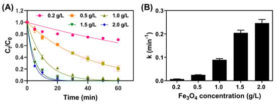 (A) TC removal plotted over time for systems with various Fe3O4 concentrations ([PS] = 1.0 mM; [TC] = 41.6 μM; pH = 4.8), and (B) the pseudo first-order rate constants of TC were obtained from the fitting the results in Figure 4A.
