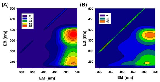 Excitation-emission matrix results acquired from the municipal effluent spiked with TC, before (A) and after (B) treating with Fe3O4/PS [Fe3O4] = 1 g/L, [PS]0 = 1 mM, [TC]0 = 41.6 μM).