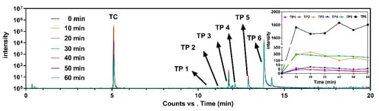 The overlapped total ion chromatogram for the experimental time for the intensity development of TC and its transformation products eluted at different retention times. The detailed intensity development for six transformation products during the experiments is top right.