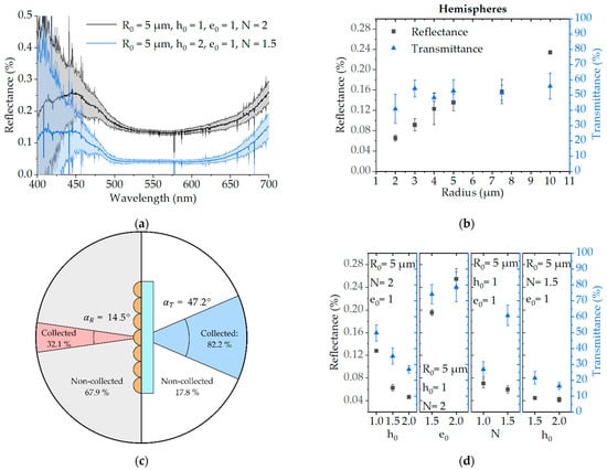 Structure’s reflectance and transmittance characteristics as a function of the design parameter from Equation (1). (a) Reflectance spectra of the most and least reflective structures with error and corresponding shape parameters; (b,d) average reflectance (at ) and transmittance of structures printed with corresponding error: (b) Hemispheres with varying radius (, and ), (d) structures with varying height factor, , elongation factor, , pyramidal factor, , and combinations of these parameters; (c) Collection angles and percentage of collected and transmitted light intensity estimation based on calculation in Section S5 (for a hemisphere with µm and at ). All errors in (a,b,d) correspond to .