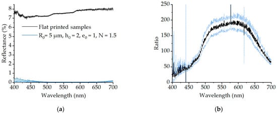 Effect of the printed geometries on the reflectance spectra. (a) Average reflectance spectra of the flat printed samples and of the optimized microlens array sample, with respective error of ; (b) Ratio between the flat and optimized structure’s reflectance with blue lines showing error of .