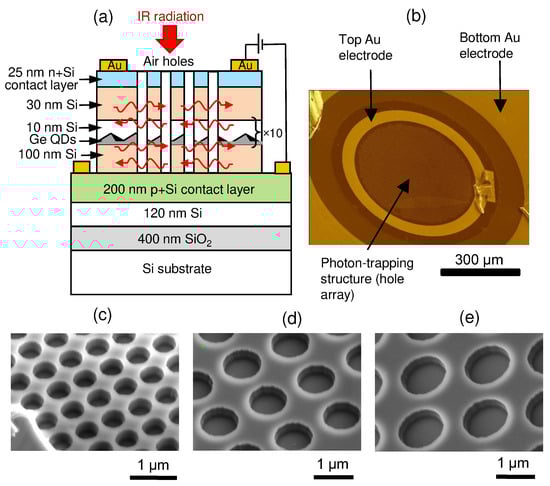 After the MBE growth, the wafers were processed into 700 μm diameter vertical pin QDIPs (Figure 1b). The hole arrays were etched (225 nm deep) up to the bottom p-Si layer with a cylindrical shape profile, serving as the photon-trapping structures. The air holes were produced by means of the reactive ion etching (RIE) of SiGe layers through a metallic template. The template was a 30-nm-thick perforated Cr film formed on the surface of the heterostructure by electron-beam lithography, deposition of the metal in a vacuum, and the subsequent lift-off process. Etching was performed in a CF4 plasma on a Plasmalab System 80 setup in the cyclic etching/cooling regime. The hole arrays have square lattice symmetry with different hole diameter d and period p values (Figure 1c–e). Devices with nm, 930/1400 nm, and 1130/1700 nm were studied. Selected array parameters are characteristic of those chosen in the literature to improve light detection at telecom wavelengths in bulk Ge/Si [30] and GeSn/Si [35] layers. The air volume fraction was the same for all devices. A reference QDIP without any etched structures was also fabricated for the comparison of device performance. Both flat and nanostructured samples were taken from a single die of the same wafer right next to each other. Top and bottom ohmic contacts were made using Au evaporated onto the sample surface and annealing at 350 °C for 5 min in an Ar atmosphere (Figure 1b). A 5-nm-thick Ti film was deposited between the 50-nm-thick gold layer and the QDIP to promote the adhesion of the Au film to the Si surface. The samples were glued with silver epoxy onto a ceramic chip carrier. The contacts were bonded with silver wires using thermocompression bonding.