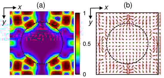 To demonstrate formation of in-plane quasi-guided modes, we inspected how the actual electric fields look in the structures under study. Calculations of near-field components distribution were carried out using the 3D finite-element frequency-domain (FEFD) method [42] with commercial software Comsol. Floquet periodic boundary conditions were used along the planar x and y directions to simulate an infinite array of unit cells. Perfectly matched layers were used along the vertical direction (z direction) to prevent the reflection of the waves from the top and bottom domain boundaries. The plane wave radiation with a linear polarization along the x-axis was incident from the substrate side of the QDIP. The simulated structures are the hole arrays shown in Figure 1c–e. The hole arrays have a square lattice symmetry with a hole depth of 255 nm. The air, SiO2, and Si regions were modeled using rectangular parallelepiped geometry with correspondent refractive indices. FEFD numerical simulation of the near-field intensity and the Poynting vector in-plane distribution at μm are shown in Figure 2 for a sample with a nanostructured surface. Here, the hole array parameters are nm and nm. The other samples behave in a similar way. In a QDIP with photon-trapping holes, the energy flux leaks from the holes into the Ge/Si layers, resulting in formation of guided lateral modes that are concentrated in the semiconductor and could be entirely absorbed by QDs. Since the lateral dimension of the devices is much larger than the thickness of the QD layer, QDIPs with photon traps can be more efficient.