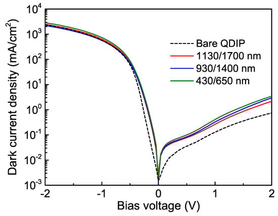 Figure 3 shows the dark current density-voltage characteristics of pin QDIPs with and without photon-trapping structure. The high on/off ratio of the devices around – is observed, manifesting good rectifying behavior. For the device with a flat surface, the dark current is 0.13 mA/cm2 at a reverse bias of 1 V. This value is two orders of magnitude lower than previously reported ones for Ge-on-Si [30,43,44] and GeSn/Ge [45] photodiodes with dislocation-rich Ge active layers. The ultralow dark current density in Ge/Si QDIPs is attributed to the formation of dislocation-free Ge QDs by strain-driven self-organization through the Stranski–Krastanov growth mode. As shown in Figure 3, the current of Ge/Si QDIPs with holes increased by around 3 times compared to the non-photon-trapping counterpart. This is probably due to the formation of crystalline defects and dangling bonds at the hole surfaces during the RIE process, which can contribute to increased current level.