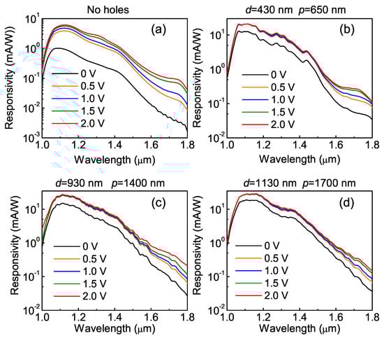Figure 4 presents the measured responsivity spectra of the QDIPs with and without photon-trapping holes with different reverse bias voltages. The reference device of this figure has a broad response and covers the near-IR spectral range up to 1.8 μm, coming from the interband transitions between the electron states in the conduction band and the hole states bound inside Ge QDs. The weak dependence of the photocurrent on the bias indicates efficient collection of photogenerated carriers. The spectra of the photon-trapping devices consist of a smoothly varying background superimposed on a set of multiple photocurrent peaks, providing evidence for the excitation of an ensemble of guided collective modes [25,46].