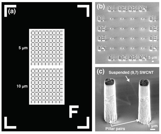 We used a quartz substrate consisting of pillar pairs manufactured using a lithographic technique [21]. The pillar-patterned substrate contained 2592 pillar pairs with a height of and spacings of 5 and , as shown in Figure 1 (1296 pairs each). To synthesize SWCNTs directly on the pillar substrate, a Co catalyst was vacuum deposited onto the pillar substrate to a thickness of . The substrate was introduced into the CVD furnace and heated under an Ar/ mixed gas (3% by volume) at a pressure of . After the specimens were heated under the Ar/ mixed gas, ethanol vapor produced by bubbling liquid ethanol with Ar/ gas was flowed to synthesize SWCNTs. The CVD temperature was varied in the range 750–870 C and the growth time of the SWCNTs was varied in the range 2–14 . The fabricated SWCNT was shown in Figure 1c. Figure 1c shows a scanning electron microscopy (SEM) image of the fabricated SWCNT between pillar pairs, and the SWCNT chirality was (9,7). We aimed to fabricate a single suspended SWCNT by adjusting the CVD condition to prevent bundling [21].