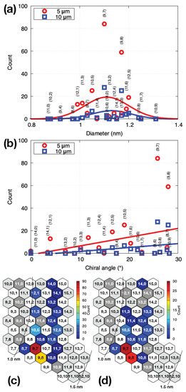 - He, M.; Jiang, H.; Kauppinen, E.I.; Lehtonen, J. Diameter and chiral angle distribution dependencies on the carbon precursors in surface-grown single-walled carbon nanotubes. Nanoscale 2012, 4, 7394–7398. [Google Scholar] [CrossRef] [PubMed]