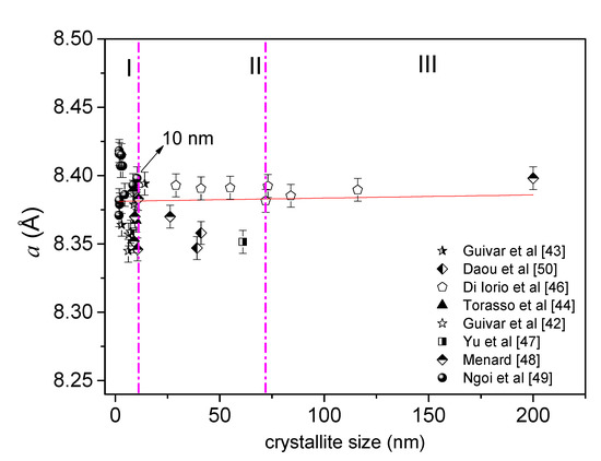 Lattice parameter a (Å) vs. crystallite size (nm) for several Fe-oxide NPs prepared by co-precipitation. Figure developed by the authors.