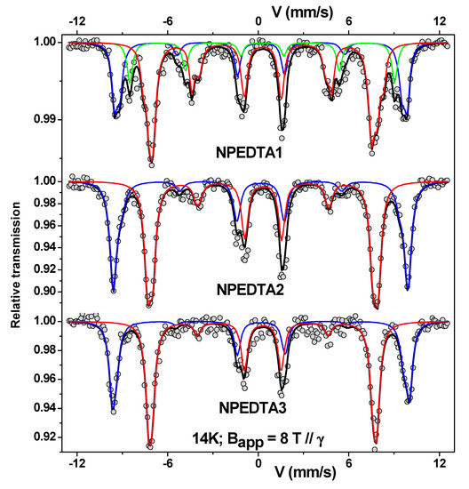 In-field Mössbauer spectra taken at 14 K in an applied field of 8 T for the ethylenediaminetetraacetic acid (EDTA) functionalized γ-Fe2O3 NPs (NPEDTA). Mössbauer spectra of the NPEDTA2 and NPEDTA3 were reproduced with permission of Elsevier [30]. 1, 2, and 3 indicates different routes of synthesis that can be checked in [30]. The lines red and blue represent the crystalline sites of γ-Fe2O3 NPs while the green line for NPEDTA1 sample is related to the surface magnetic contribution.