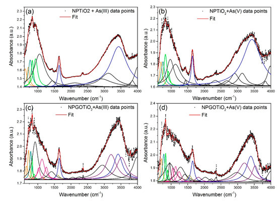 On the other hand, a Fourier-transform infrared (FTIR) spectroscopy analysis was carried out in order to analyze the physicochemical properties of the functional IR groups of As(III) and As(V) species adsorbed onto bare γ-Fe2O3 NPs, binary NPTiO2, and ternary NPGOTiO2 nanocomposites, and also to confirm the adsorption mechanisms and physicochemical properties of the Fe-oxide NPs. A multiple peak fit was determined, where each noticeable IR mode was represented by a Lorentzian peak as presented in Figure 6 and Figure 7. Furthermore, the center positions of the Lorentzian lines are shown in Table 3. The characteristic IR broad bands of the As-O vibration mode have been previously identified at 800–950 cm−1 for As(V) [125,126]. In the case of As(III) adsorption, the As-O band shifted from its characteristic position (at 780–800 cm−1) to the same range of As(V). This is because of the As(III) reduction caused by γ-Fe2O3 NPs. Moreover, it seems that TiO2 contributed negatively to the shifting, since Pena et al. [125] mentioned that As-O groups weakened with As(III) adsorption onto TiO2 NPs.