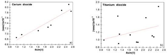 where and ; the plot vs. is shown in the Figure 4 [23]. The slope of the plotted straight line provided average crystallite sizes. From the data shown in Figure 4a,b, we obtained values of 10.3 (8) and 5.6 (2) nm for CeO2 and TiO2 NPs, respectively. From the intercept, we had the intrinsic ε of the nanocrystals. We can observe from Figure 4a,b that the H–W method has a better-defined linear trend than previous methods as a result of the integral broadening to a Voigt function.