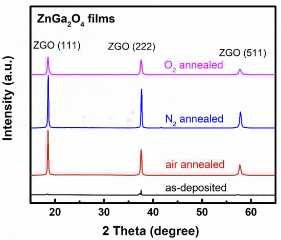 X-ray diffraction patterns of ZnGa2O4 (ZGO) films under different annealing ambiences.