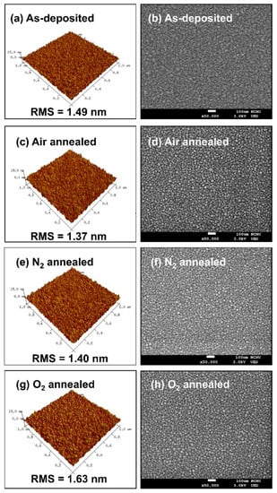 Figure 2a–h shows the AFM and SEM micrographs of as-deposited and annealed ZnGa2O4 films under different annealing ambiences. The RMS surface roughness of the as-deposited ZnGa2O4 film was 1.49 nm, whereas the RMS surface roughness of the annealed ZnGa2O4 film under air, nitrogen, and oxygen ambience was 1.37, 1.40, and 1.63 nm, respectively. This indicates that the ZnGa2O4 film annealed under air and nitrogen ambience had a smooth surface, which is beneficial for PDs. A smooth surface leads to a lower surface area, which results in low surface density states for the ZnGa2O4 film. The RMS surface roughness was found to be relatively larger after annealing under oxygen ambience, which could be due to the large amount of oxygen diffused by the adsorption of oxygen in the ZnGa2O4 film [24]. The SEM micrographs of the as-deposited ZnGa2O4 film revealed the columnar structure and irregular arrangement of grains with a rough surface, which were found to be dense and smooth after annealing under air and nitrogen ambiences with the presence of some nano-voids. It is well-known that high-temperature annealing reduces the surface energy between grains, which increases grain growth and reduces surface roughness due to the coalescence of small grains [25,26]. ZnGa2O4 film annealed under oxygen ambience was found to be oxidized due to the absorption of oxygen in the film, which possesses a dense and highly rough surface with fewer nano-voids than other films [24]. These SEM results were found to be in accordance with the AFM and XRD results.