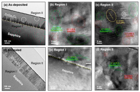 Figure 3 depicts the cross-sectional and high-resolution transmission electron micrographs (HRTEM) of as-deposited and annealed ZnGa2O4 film under air ambience. The cross-sectional TEM micrograph of as-deposited ZnGa2O4 film is shown in Figure 3a, while region I and region II of this film are explored in Figure 3b,c, respectively. This as-deposited ZnGa2O4 film demonstrated columnar grains near the substrate region and possessed the amorphous, ZnO (100), Ga2O3 (201), and ZnGa2O4 (111) phases. These phases are evident in this film, as it was deposited at a substrate temperature of 400 °C. The d-spacing of ~2.83, 3.70, and 4.83 Å (compatible with 4.80 Å) was measured, which corresponded to the ZnO (111), Ga2O3(201), and ZnGa2O4 (111) phases, respectively. The rapid thermal annealing was performed at the temperature of 700 ℃ for 1 min under air ambience to improve the crystallinity of this film. The oxygen present in the air ambience during thermal annealing played a significant role in eliminating the intrinsic defects, such as amorphous regions and oxygen vacancies in the films. A cross-sectional TEM micrograph of the annealed ZnGa2O4 film under air ambience is shown in Figure 3d, and its region I and region II are explored in Figure 3e,f, respectively. These regions (I and II) of the annealed ZnGa2O4 film demonstrated that rapid thermal annealing under air ambience suppressed the amorphous and Ga2O3 phases by the local bond rearrangement at the interface between the amorphous phase and the crystalline phase, and achieved a quasi-single-crystalline ZnGa2O4 structure, as shown in Figure 3e,f.
