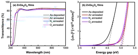 (a) Transmittance spectrum and (b) Tauc plot of the as-deposited and annealed ZnGa2O4 films under different annealing ambiences.