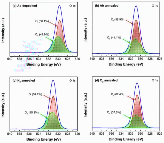 Figure 5 shows the O 1s XPS spectra of the as-deposited and annealed ZnGa2O4 films under different ambiences. In order to define the oxygen vacancies associated with the films, the O 1s XPS spectra of the films were fitted with the Gaussian function and deconvoluted into two peaks named OI and OII. The OI peak centered around the lower binding energies of 530–531 eV represents the oxygen deficiency in the films, whereas the OII peak centered at higher binding energies of 531–532 eV represents the oxygen vacancies in the film [27]. The integrated areas of the OII peak of the ZnGa2O4 films were found to be 43.9, 41.1, 45.3, and 37.6% for as-deposited, air annealed, N2 annealed, and O2 annealed ambiences, respectively. The oxygen present in the air ambience can fill a certain amount of oxygen vacancy. Hence, the area of OII peak was found to be decreased from 43.9 to 41.1% during air annealing, as shown in Figure 5b. The area of the OII peak was found to be higher (45.3%) in an N2 atmosphere, which can be attributed to the disassociation of oxygen molecules from the films during annealing. This resulted in an increased number of oxygen vacancies, as shown in Figure 5c [25]. By observing the integrated areas of OII peaks from Figure 5a–d, it was found that the O2-annealed ZnGa2O4 film had the lowest integrated area of OII peaks (37.6%). It is well-known that an oxygen-rich ambience reduces the number of oxygen vacancies, which weakens the crystalline structure [28]. This phenomenon is in accordance with our XRD results, as shown in Figure 1, where oxygen ambience deteriorated the crystalline structure. Since oxygen vacancies affect the optoelectronic properties of ZnGa2O4 film, the considerable suppression of oxygen vacancies demonstrates the tunability of the film characteristics depending on the annealing ambiences.