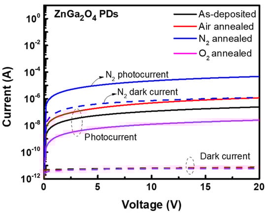 I–V characteristics of the as-deposited and annealed ZnGa2O4 PDs under different annealing ambiences.