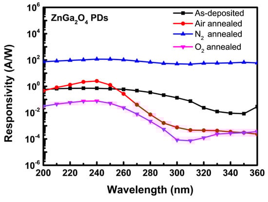 Spectral response of as-deposited and annealed ZnGa2O4 PDs under different annealing ambiences.