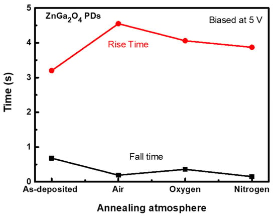 Figure 8 shows the rise time and fall time for the as-deposited and annealed ZnGa2O4 PDs under different annealing ambiences. Rise time is the time that the PD takes to change its response from 10% to 90% of the maximum photocurrent with the illumination of light. Fall time is the time that the PD takes to change its response from 90% to 10% of the maximum photocurrent without the illumination of light. These two characteristics (rise time and fall time) represent the response time of a photodetector. ZnGa2O4 PD annealed under air ambience possesses a higher rise time of 4.55 s but a lesser fall time of 0.19 s than other PDs (as-deposited, annealed ZnGa2O4 PDs under nitrogen and oxygen ambiences), which could be due to the indirect bandgap properties of the spinel-cubic ZnGa2O4 structure [36]. The high rise time for the ZnGa2O4 PD annealed under air ambience could be attributed to the excitation of photogenerated carriers, which reached higher energy states above the conduction band. These excited photogenerated carriers then reverted to the conduction band by releasing energy and resulted in a high rise time. Despite the fact that the response time of ZnGa2O4 PDs annealed in air ambience is higher than that of other ZnGa2O4 PDs annealed under other ambiences, the responsivity associated with this air annealed ZnGa2O4 PD is found to be considerable for use in DUV PDs.