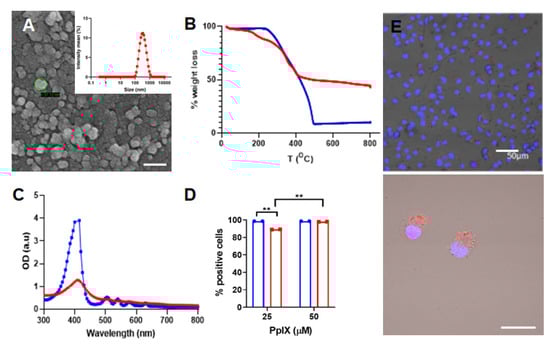 Characterization of PpIX-PSilQ NPs. (A) DLS and SEM image of PpIX-PSilQ NPs. Scale bar = 100 nm. (B) TGA plot for PpIX (blue) and PpIX-PSilQ NPs (red). (C) UV-vis spectrum of PpIX (blue) and PpIX-PSilQ NPs (red). (D) Flow cytometry data of PpIX-PSilQ nanoparticles (red) and free PpIX (blue) at different concentrations (25 and 50 µM PpIX) in A375 cells after 24 h of incubation. Statistics: two-way ANOVA using Tukey’s multiple comparison test; ** p ≤ 0.01. (E) Confocal microscopy images of A375 cells after 24 h incubation with PpIX-PSilQ NPs (25 µM PpIX). Image(s) show merged fluorescent channels of Hoechst-33342 nuclear stain dye (blue), PpIX fluorescence (red), and brightfield. Scale bars = 50 µm and 20 µm.