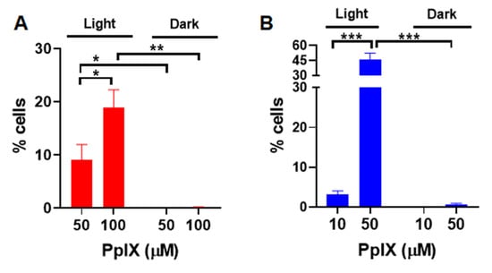 The generation of apoptosis and/or necrosis promoted by PDT using PpIX-PSilQ NPs was analyzed using flow cytometry in the presence of the SYTOX Blue dead-cell nuclear stain assay and Annexin V Apoptosis Detection Kit. SYTOX Blue dye penetrates compromised plasma membrane, staining nucleic acids inside the cells. The Annexin V assay contains a FITC-labeled antibody that binds to phosphatidylserine residues expressed on the plasma membrane of apoptotic cells. Two different concentrations of nanoparticles were evaluated in this experiment: 50 and 100 µM, based on the amount of PpIX. These concentrations were selected with the purpose of the photoactivity associated to the nanoparticles, which triggers a measurable response for the cell death mechanisms. Cells treated with nanoparticles in the presence of light showed 5.8 ± 1.7% and 24.2 ± 1.7% of Annexin-V-positive cells for 50 and 100 µM, respectively (Figure 3A). Dark controls for nanoparticles were used as negative controls, showing only 0.7 ± 0.6% and 4.7 ± 1.2% of Annexin-V-positive cells for the same concentrations (Figure S5A). A similar analysis was performed for PpIX at concentrations of 10 and 50 µM. As depicted in Figure 3B, cells treated with 50 µM of PpIX after light irradiation exhibited 62.3 ± 17.6% of Annexin-V-positive cells. PpIX at 10 µM did not show a significant production of apoptotic cells. Dark controls for PpIX show 3.7 ± 1.2% of Annexin-V-positive cells for 50 µM (Figure S5B). Cells treated with nanoparticles showed 2.6 ± 0.0% and 7.4 ± 1.8% necrotic cells for treatment concentrations 50 and 100 µM in the presence of light (Figure 3A). Nanoparticle treatment led to less than 0.1% necrotic cell death for 50 and 100 µM in the absence of light (Figure S5A). Necrosis was observed in 3.5 ± 2.3% and 4.9 ± 0.4% of the analyzed population of cells treated with 10 and 50 µM of free PpIX (Figure 3B) in the presence of light. In the case of dark controls, free PpIX treatment caused necrosis in 3.1 ± 1.0% and 3.9 ± 0.2% of cells treated with 10 and 50 µM, respectively (Figure S5B).