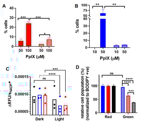 (A) Apoptotic (red solid bars) and necrotic (red checkered bars) cells after PDT treatment with PpIX-PSilQ NPs (50 and 100 µM equivalent of PpIX). (B) Apoptotic (blue solid bars) and necrotic (blue checkered bars) cells after PDT treatment with PpIX (10 and 50 µM). (C) Reaction rate values of NADP+ generation for control (black), PpIX-PSilQ NPs (50 µM PpIX eq.) (red), and PpIX (50 µM) (blue). (D) Quantification of lipid peroxidation using confocal microscopy in A375 cells treated with control (black), PpIX-PSilQ NPs (50 µM PpIX eq.) (red), and PpIX (50 µM) (blue) in the red (solid bars) and green (dashed bars) channels. Data are represented as mean ± SD. Statistics: two-way ANOVA using Tukey’s multiple comparison test: **** p ≤ 0.0001, *** p ≤ 0.001, ** p ≤ 0.01, * p ≤ 0.05, and ns: p > 0.05.