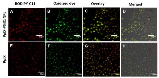 Lipid peroxidation detected by BODIPY™ 581/591 C-11 sensor. Confocal micrographs of A375 cells inoculated with (A–D) PpIX-PSilQ nanoparticles or (E–H) PpIX after light irradiation. The red channel depicts the presence of BODIPY 581/591 C-11 (A,E). The green channel shows the fluorescence corresponding to the oxidized version of BODIPY 581/591 C-11 (B,F). Merged image of the red and green channels (C,G) with the brightfield image (D,H). Scale bar = 50 µm.