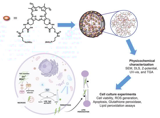 We synthesized PpIX-PSilQ nanoparticles for the purpose of this work. The physicochemical properties of this platform are similar to our previously reported systems [8,9]; however, this platform does not have stimuli-responsive features. Phototoxicity, generation of ROS, and cellular internalization were also confirmed using a malignant melanoma cell line, A375. Cell death mechanisms were investigated using different assays, including Annexin V apoptosis, glutathione peroxidase activity, and lipid peroxide probe C-11 BODIPY. The results show that PpIX-PSilQ nanoparticles in the presence of light produce cell death in A375 cells, which is correlated to apoptosis and ferroptosis. The role of ferroptosis in phototoxicity of the PpIX-PSilQ system was further confirmed using a ferroptosis inhibitor. These results demonstrated that ferroptosis is an important cell death mechanism associated to the PDT performance of PpIX-PSilQ nanoparticles.