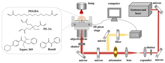 Chemical structure of the photoresist and the schematic of femtosecond laser TPP system.