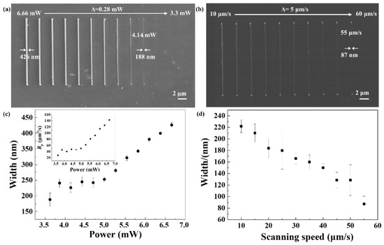 (a) SEM image of nanolines achieved with laser power ranging from 6.66 to 3.3 mW at 10 μm/s. (b) SEM image of nanolines achieved with scanning speed ranging from 10 to 60 μm/s at 6.40 mW. (c) The dependence of line width and polymerization rate (inset) on laser power, respectively. (d) The dependence of line width on scanning speed.
