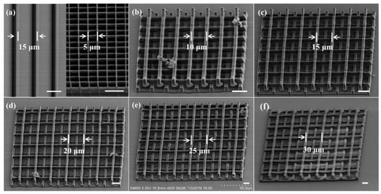 The geometry, dimension, strut parameters and pore size of scaffold play important roles in modulating cell growth, proliferation and migration, as previously reported [43]. To systematically investigate the relationship of the microstructures and cells, hydrogel micropattern line array, ST scaffold and 3D microscaffolds with pore size and strut spacing against cells were fabricated by TPP (Figure 4). The laser scanning speed was 150 μm/s and the average power (before the objective lens) was 5.6 mW. In the line array (left in Figure 4a), the line height, width and line spacing are 3.5 μm, 3 μm, and 15 μm, respectively. ST scaffold strut has a width of 0.5 μm, a pore size of 5 μm, and a total height of 9.6 μm. The partial enlarged view is shown in Figure S1. Figure 4b–f shows the SEM images of 3D microscaffolds with different porosities. The strut cross section is 3 μm × 3.5 μm (smaller than the cell seed). The distance between the struts was adjusted between 10 μm, 15 μm, 20 μm, 25 μm and 30 μm (larger than the cell seed but smaller than or equal to the spread cell), with corresponding porosities of 69.7%, 79.5%, 84.4%, 87.4%, and 89.3%. The individual scaffold is 200 μm × 200 μm in the transverse dimension and 14 μm in height. The refinement of the strut spacing against the cell in the 3D microscaffold enables us to study the influence of relative size design on regulation of cell morphology and behavior.