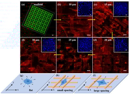Confocal fluorescent microscopy images of (a) scaffold (excited by 488 nm) and cells grown on 3D microscaffolds with strut spacing of (b) 10 μm, (c) 15 μm, (d) 20 μm, (e) 25 μm, (f) 30 μm, respectively. (g–i) Schematic of the mechanism for regulating F-actin synthesis through sensing information by filopodia. Scale bar is 10 μm, while the scale bar in the inset is 20 μm.