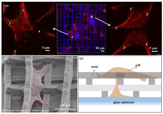 Lamellipodia play an important role in cell adhesion, migration and cell–cell interactions. Therefore, changes of lamellipodia in different scaffolds will affect the behavior of cells. Generally, fibroblasts L929 are in a spindle or triangular shape, with two or three lamellipodia. Cells on 3D microscaffolds have four, five, or even more lamellipodia (Figure 7a), and show a “starfish-like” microfilament cytoskeleton. Moreover, lamellipodia on 3D microscaffold can extend downward in the longitudinal direction along the struts, except spreading horizontally, thus exhibiting a perfect 3D shape (Figure 7b). Figure 7c is the schematic diagram of a cell in a 3D microscaffold. So far, few studies achieving 3D growth of single cells have been reported [49]. Different cell behaviors have been achieved by using 3D microscaffolds, which is very important for maintaining the biological functions of the cells in vivo. Furthermore, this would help to improve the efficiency of information exchange and material exchange between cells.