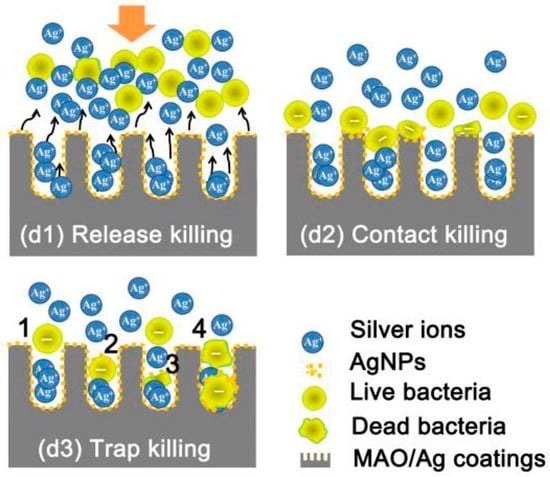Schematic illustration of the possible antibacterial mechanisms involved during adhesion of bacteria to nanotubes: (d1) The majority of planktonic bacteria are repulsed from the surface by releasing Ag+ ions; (d2) Some of the landed bacteria are disrupted via contact with Ag nanoparticles on the surface; (d3) Surviving bacteria with a negative membrane charge are attracted into micropores (positively charged by interior silver) and killed (Reprinted with permission from ref. [96]. Copyright 2015 Biomaterials).