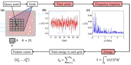 Data preparation procedure for machine learning. Boxes in red are properties of each individual atoms. (a) Illustration of query point and grid construction. (b) Displacement time series and (c) the corresponding frequency response of a vibrating atom in the graphene sheet.