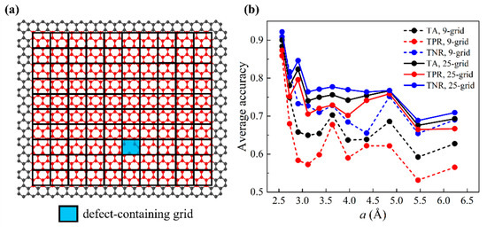 The prediction of one-defect graphene sheets was studied first. The preparation of training data based on the smaller graphene is detailed as follows: First, we discretized the entire vibrating graphene domain with an -by- mesh, as shown in Figure 3a. is an integer parameter ranging from 7 to 17, giving values of from 6.23 Å to 2.57 Å. This practice aims to thoroughly scan the graphene domain during training. The ratio ensures that the numbers of grids in the two orthogonal directions (i.e., the armchair and the zigzag directions) are equal. To prepare unbiased training data for our binary classification model, we equalized the numbers of data and data. Here, we purposefully selected the defect-containing grid as the center grid and constructed the rest of the grids around it. Then, we randomly selected another grid as a center grid, which was bound to be defect-free. Hence, each graphene provides two sets of training data, and the numbers of data and data are equal. The total number of one-defect graphene sheets for training is 10,148. However, not all these graphene sheets were used to construct training data—graphene sheets that contained a near-edge/-corner defect were excluded due to different lengths of feature vectors. For the 9- (25-) grid approach, graphene sheets whose defect-containing center grids that were within one (two) grid(s) to graphene edges were excluded. We addressed a total of five types of near-edge/-corner defects separately and assigned the results to the Supplementary Material. Data were randomly split into 9:1 for training and validation. Validation accuracies were based on the average of three different splits. Figure 3b shows validation accuracies (TA, TPR, TNR) as a function of grid size . The results of 9-grid and 25-grid approaches are also compared. It is shown that as increases, all three accuracy metrics decrease. This suggests that smaller grids give rise to higher training accuracies. In addition, 9-grid and 25-grid approaches have similar trends and the 25-grid approach strikes higher accuracy in all three metrics. Hereafter, machine learning results will be based on only the 25-grid approach for simplicity. We also tested out specifying the query point location and in the feature vectors, where are the coordinates of the query point. It is shown that adding these two features has little impact on the accuracies of either 9-grid and 25-grid approaches, as illustrated in Figure S1 in the Supplementary Material.