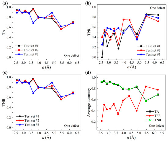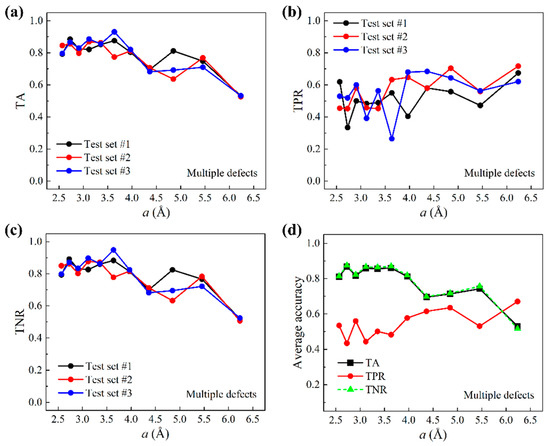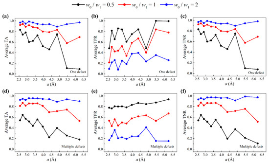 By tuning the weights and , we change the significance attached to the correct prediction of defects and non-defects. Concretely, if , accuracy of defects is emphasized; if , accuracy of non-defects is emphasized; if , defects and non-defects are equally emphasized, which is the default for all previous machine learning results. Here, we compare the prediction accuracies using a weighted cost function with weight ratios . Figure 6a–c show the average test accuracies of one-defect cases. Figure 6d–f show the average test accuracies of multiple-defect cases. In all cases, TPR increases as decreases, while TNR increases as increases. For all three metrics, there is a tradeoff between TPR and TNR, giving us the opportunity to emphasize one label over another. Notably, the weight ratio gives the highest TA. This is because in both one-defect and multiple-defect test sets, data outnumber data. By applying weighted cost function, we gain the ability to improve the prediction accuracy of defects while maintaining a relatively low false positive rate.